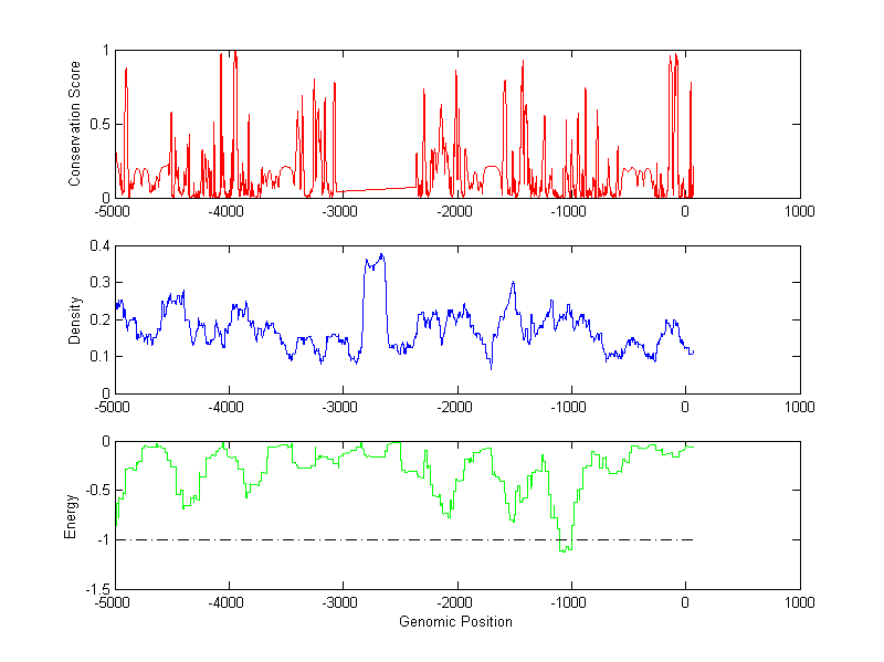 About the profiles: The conservation profile (red curve) is about conservation scores of the promoter sequences. Conservation was determined from an eight-way alignment of human, chimpanzee, dog, mouse, rat, chicken, zebrafish and fugu sequences. The conservation was quantified by a conservation score between 0 and 1, with 1 as highest conservation. The conservation score was obtained from UCSC genome databases. The density profile (blue curve) is about density of all TF binding sites. The energy profile (green curve) is about energy for module detection based on TF interaction. The positions with energy less than -1 indicate the existence of CRMs. Download: Conservation profileDensity profile Energy profile CRM summary |