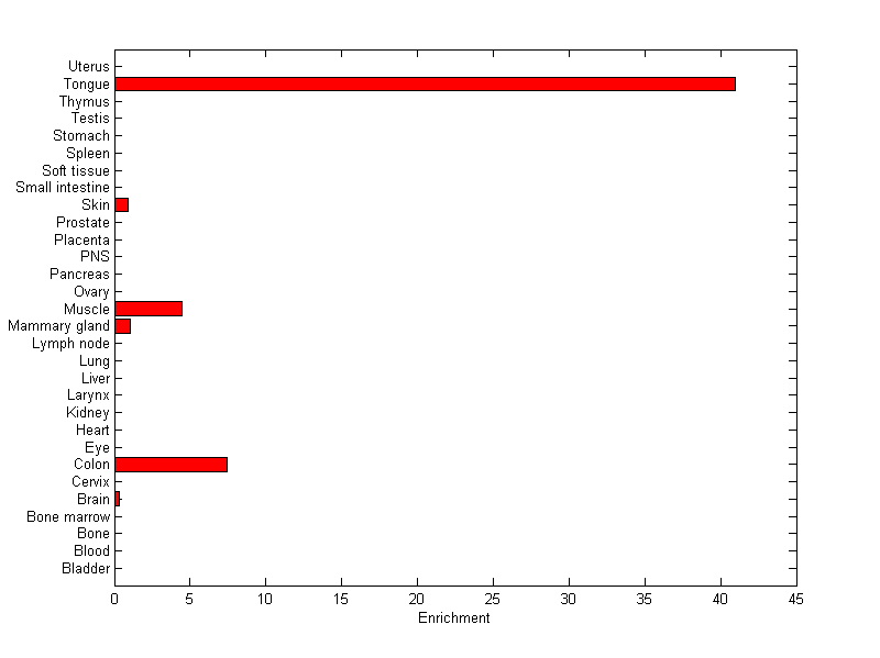 About the profile: The expression level is normalized with tissue-library size. Each value for a gene in a tissue is a ratio of observed ESTs to the expected one in this tissue. The expected number of ESTs is the product of total ESTs of the gene and the fraction of total ESTs in the tissue among all ESTs in 30 tissues. Summary: This gene is preferentially expressed in [colon, tongue] Download: |