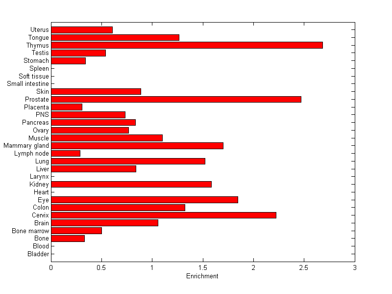 The expression level is normalized with tissue-library size. Each value for a gene in a tissue is a ratio of observed ESTs to the expected one in this tissue. The expected number of ESTs is the product of total ESTs of the gene and the fraction of total ESTs in the tissue among all ESTs in 30 tissues.