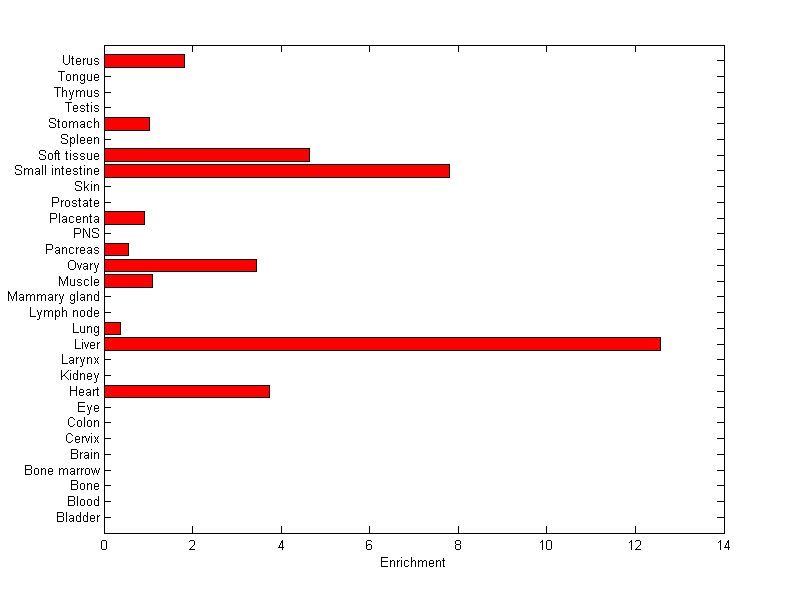 The expression level is normalized with tissue-library size. Each value for a gene in a tissue is a ratio of observed ESTs to the expected one in this tissue. The expected number of ESTs is the product of total ESTs of the gene and the fraction of total ESTs in the tissue among all ESTs in 30 tissues.