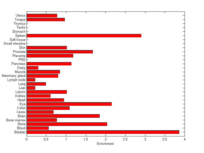 The expression level is normalized with tissue-library size. Each value for a gene in a tissue is a ratio of observed ESTs to the expected one in this tissue. The expected number of ESTs is the product of total ESTs of the gene and the fraction of total ESTs in the tissue among all ESTs in 30 tissues.