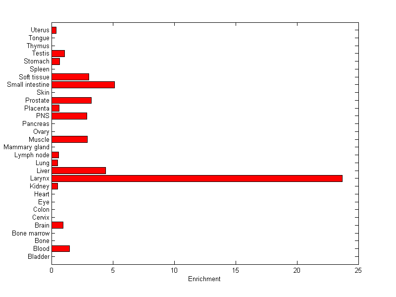 The expression level is normalized with tissue-library size. Each value for a gene in a tissue is a ratio of observed ESTs to the expected one in this tissue. The expected number of ESTs is the product of total ESTs of the gene and the fraction of total ESTs in the tissue among all ESTs in 30 tissues.