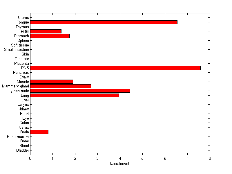 The expression level is normalized with tissue-library size. Each value for a gene in a tissue is a ratio of observed ESTs to the expected one in this tissue. The expected number of ESTs is the product of total ESTs of the gene and the fraction of total ESTs in the tissue among all ESTs in 30 tissues.