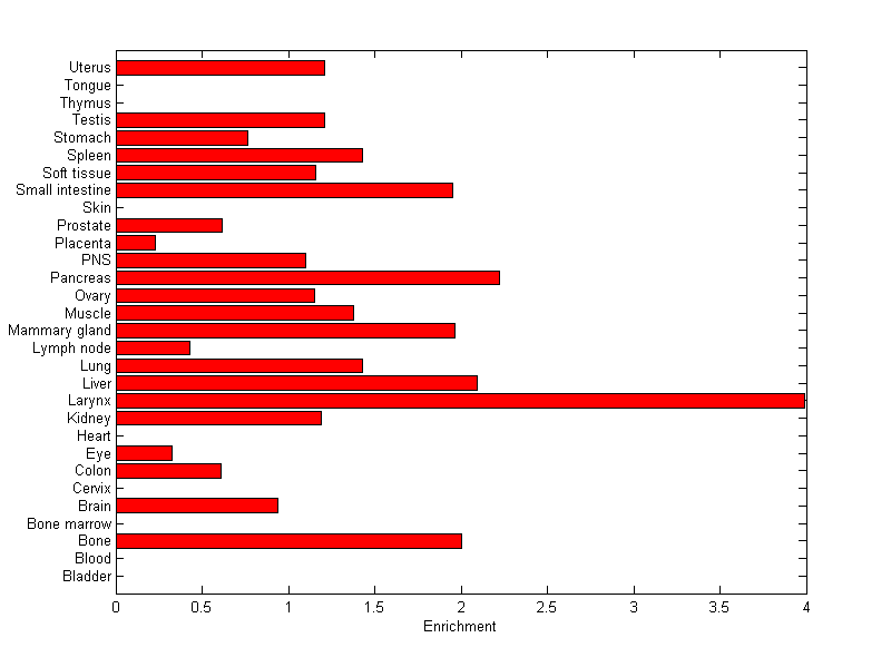 The expression level is normalized with tissue-library size. Each value for a gene in a tissue is a ratio of observed ESTs to the expected one in this tissue. The expected number of ESTs is the product of total ESTs of the gene and the fraction of total ESTs in the tissue among all ESTs in 30 tissues.