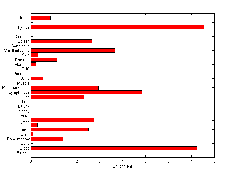 The expression level is normalized with tissue-library size. Each value for a gene in a tissue is a ratio of observed ESTs to the expected one in this tissue. The expected number of ESTs is the product of total ESTs of the gene and the fraction of total ESTs in the tissue among all ESTs in 30 tissues.