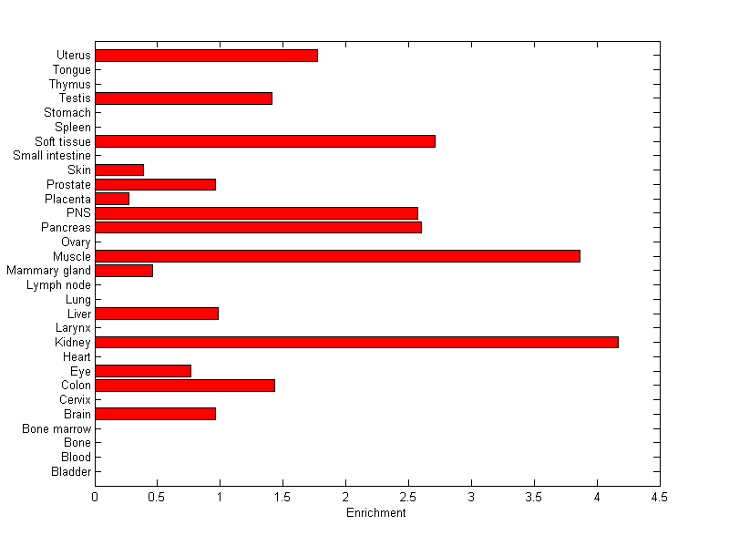 The expression level is normalized with tissue-library size. Each value for a gene in a tissue is a ratio of observed ESTs to the expected one in this tissue. The expected number of ESTs is the product of total ESTs of the gene and the fraction of total ESTs in the tissue among all ESTs in 30 tissues.