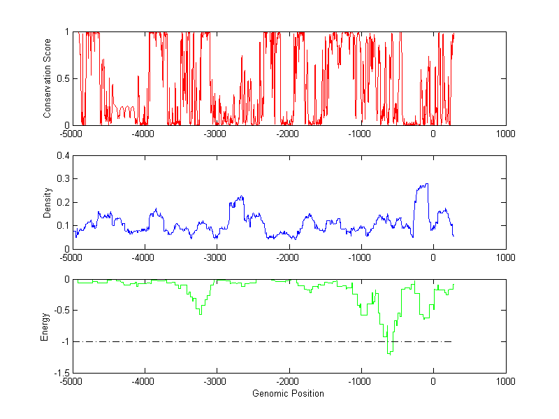 The energy profile (green curve) is about energy for module detection based on TF interaction. The positions with energy less than -1 indicate the existence of CRMs.