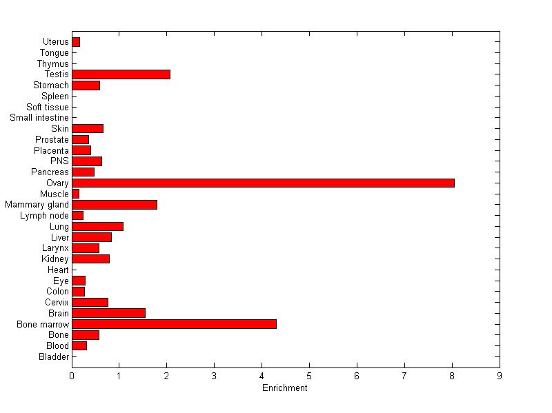 The expression level is normalized with tissue-library size. Each value for a gene in a tissue is a ratio of observed ESTs to the expected one in this tissue. The expected number of ESTs is the product of total ESTs of the gene and the fraction of total ESTs in the tissue among all ESTs in 30 tissues.