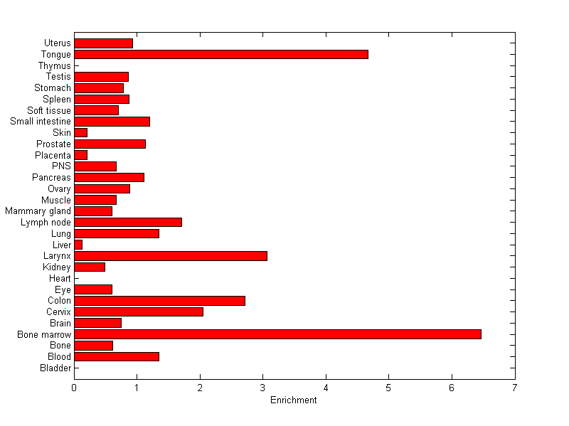 The expression level is normalized with tissue-library size. Each value for a gene in a tissue is a ratio of observed ESTs to the expected one in this tissue. The expected number of ESTs is the product of total ESTs of the gene and the fraction of total ESTs in the tissue among all ESTs in 30 tissues.