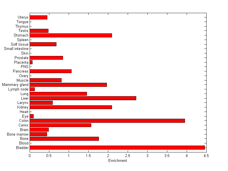 The expression level is normalized with tissue-library size. Each value for a gene in a tissue is a ratio of observed ESTs to the expected one in this tissue. The expected number of ESTs is the product of total ESTs of the gene and the fraction of total ESTs in the tissue among all ESTs in 30 tissues.