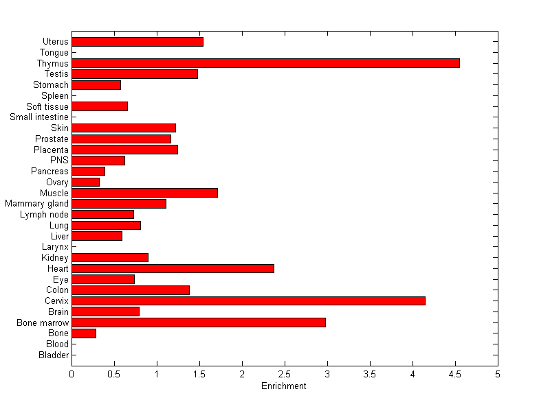 The expression level is normalized with tissue-library size. Each value for a gene in a tissue is a ratio of observed ESTs to the expected one in this tissue. The expected number of ESTs is the product of total ESTs of the gene and the fraction of total ESTs in the tissue among all ESTs in 30 tissues.