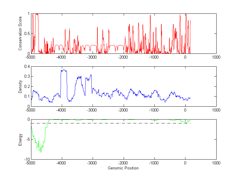 The energy profile (green curve) is about energy for module detection based on TF interaction. The positions with energy less than -1 indicate the existence of CRMs.