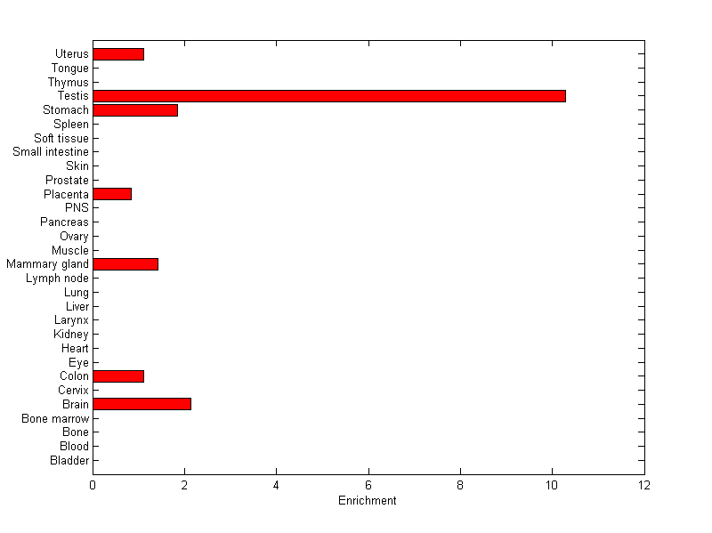 The expression level is normalized with tissue-library size. Each value for a gene in a tissue is a ratio of observed ESTs to the expected one in this tissue. The expected number of ESTs is the product of total ESTs of the gene and the fraction of total ESTs in the tissue among all ESTs in 30 tissues.