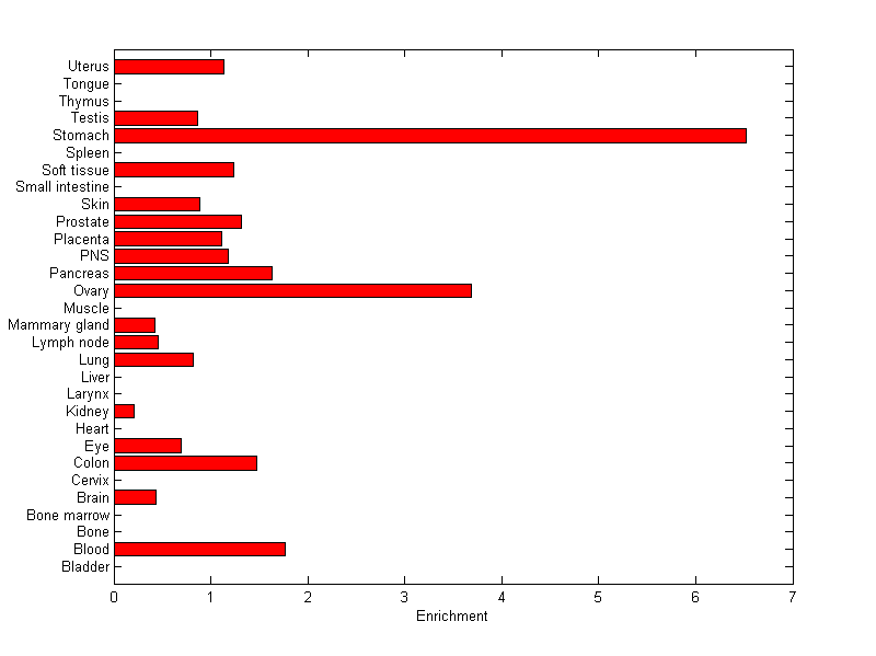 The expression level is normalized with tissue-library size. Each value for a gene in a tissue is a ratio of observed ESTs to the expected one in this tissue. The expected number of ESTs is the product of total ESTs of the gene and the fraction of total ESTs in the tissue among all ESTs in 30 tissues.
