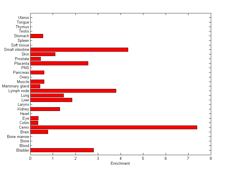 The expression level is normalized with tissue-library size. Each value for a gene in a tissue is a ratio of observed ESTs to the expected one in this tissue. The expected number of ESTs is the product of total ESTs of the gene and the fraction of total ESTs in the tissue among all ESTs in 30 tissues.