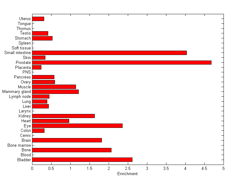 The expression level is normalized with tissue-library size. Each value for a gene in a tissue is a ratio of observed ESTs to the expected one in this tissue. The expected number of ESTs is the product of total ESTs of the gene and the fraction of total ESTs in the tissue among all ESTs in 30 tissues.