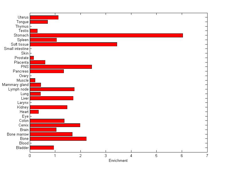 The expression level is normalized with tissue-library size. Each value for a gene in a tissue is a ratio of observed ESTs to the expected one in this tissue. The expected number of ESTs is the product of total ESTs of the gene and the fraction of total ESTs in the tissue among all ESTs in 30 tissues.