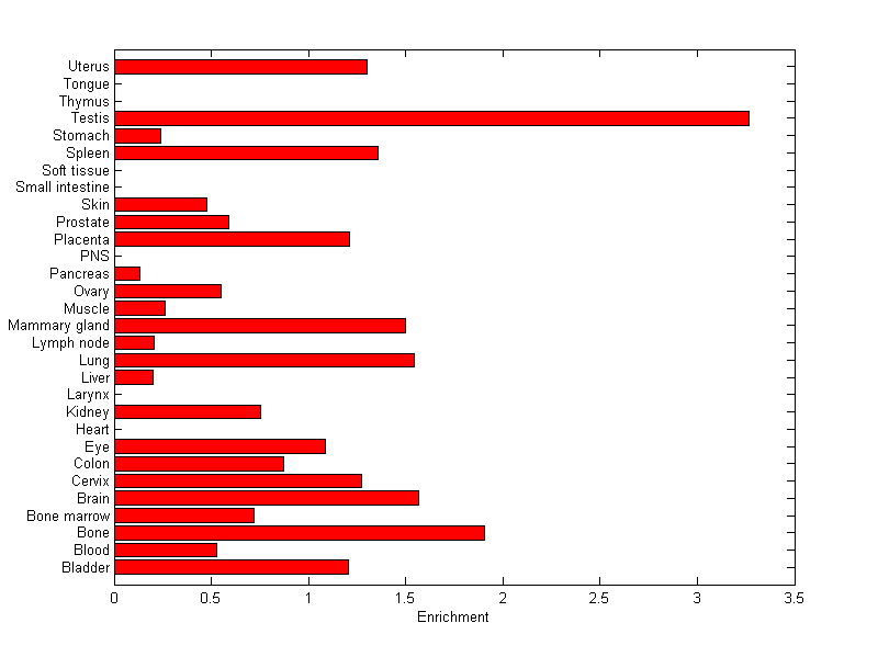 The expression level is normalized with tissue-library size. Each value for a gene in a tissue is a ratio of observed ESTs to the expected one in this tissue. The expected number of ESTs is the product of total ESTs of the gene and the fraction of total ESTs in the tissue among all ESTs in 30 tissues.