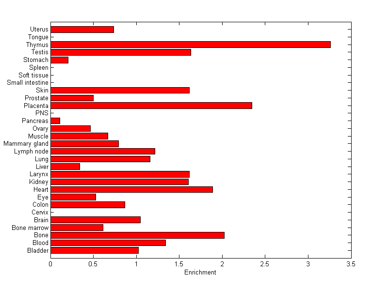 The expression level is normalized with tissue-library size. Each value for a gene in a tissue is a ratio of observed ESTs to the expected one in this tissue. The expected number of ESTs is the product of total ESTs of the gene and the fraction of total ESTs in the tissue among all ESTs in 30 tissues.