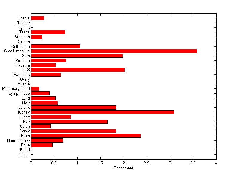 The expression level is normalized with tissue-library size. Each value for a gene in a tissue is a ratio of observed ESTs to the expected one in this tissue. The expected number of ESTs is the product of total ESTs of the gene and the fraction of total ESTs in the tissue among all ESTs in 30 tissues.