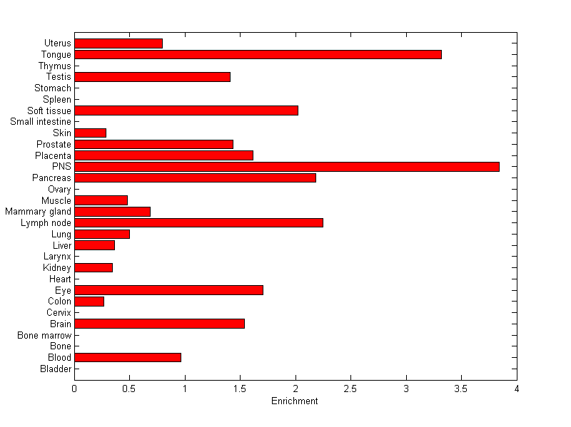 The expression level is normalized with tissue-library size. Each value for a gene in a tissue is a ratio of observed ESTs to the expected one in this tissue. The expected number of ESTs is the product of total ESTs of the gene and the fraction of total ESTs in the tissue among all ESTs in 30 tissues.