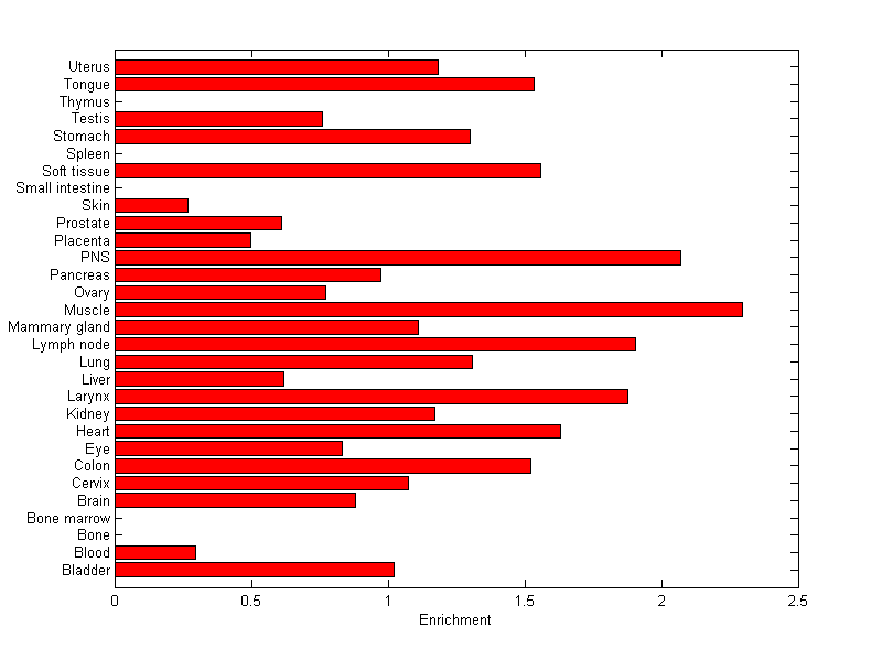 The expression level is normalized with tissue-library size. Each value for a gene in a tissue is a ratio of observed ESTs to the expected one in this tissue. The expected number of ESTs is the product of total ESTs of the gene and the fraction of total ESTs in the tissue among all ESTs in 30 tissues.