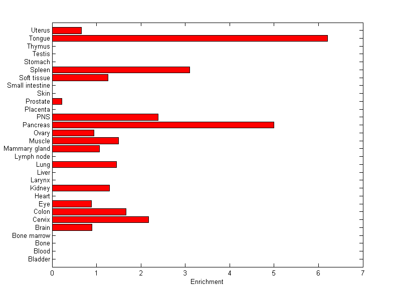 The expression level is normalized with tissue-library size. Each value for a gene in a tissue is a ratio of observed ESTs to the expected one in this tissue. The expected number of ESTs is the product of total ESTs of the gene and the fraction of total ESTs in the tissue among all ESTs in 30 tissues.