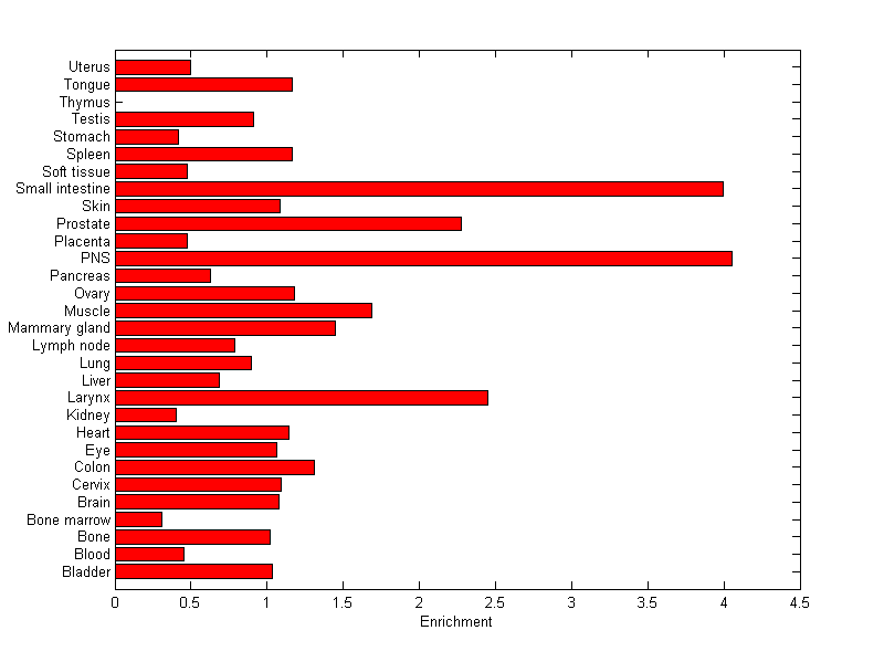 The expression level is normalized with tissue-library size. Each value for a gene in a tissue is a ratio of observed ESTs to the expected one in this tissue. The expected number of ESTs is the product of total ESTs of the gene and the fraction of total ESTs in the tissue among all ESTs in 30 tissues.