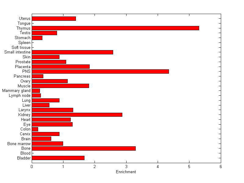 The expression level is normalized with tissue-library size. Each value for a gene in a tissue is a ratio of observed ESTs to the expected one in this tissue. The expected number of ESTs is the product of total ESTs of the gene and the fraction of total ESTs in the tissue among all ESTs in 30 tissues.