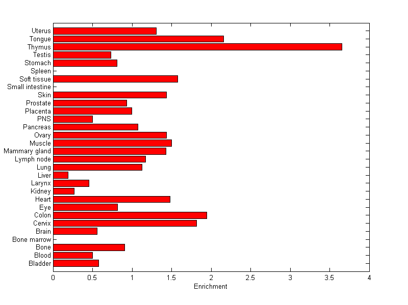 The expression level is normalized with tissue-library size. Each value for a gene in a tissue is a ratio of observed ESTs to the expected one in this tissue. The expected number of ESTs is the product of total ESTs of the gene and the fraction of total ESTs in the tissue among all ESTs in 30 tissues.