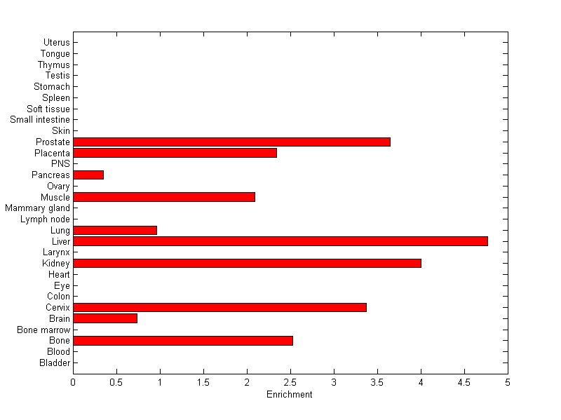 The expression level is normalized with tissue-library size. Each value for a gene in a tissue is a ratio of observed ESTs to the expected one in this tissue. The expected number of ESTs is the product of total ESTs of the gene and the fraction of total ESTs in the tissue among all ESTs in 30 tissues.