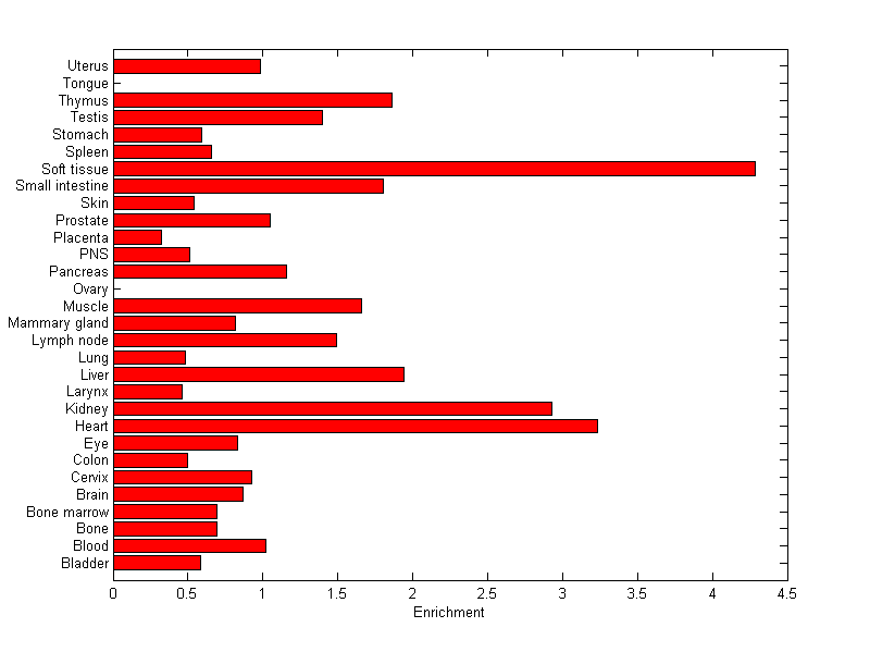 The expression level is normalized with tissue-library size. Each value for a gene in a tissue is a ratio of observed ESTs to the expected one in this tissue. The expected number of ESTs is the product of total ESTs of the gene and the fraction of total ESTs in the tissue among all ESTs in 30 tissues.