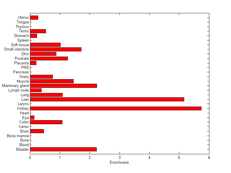 The expression level is normalized with tissue-library size. Each value for a gene in a tissue is a ratio of observed ESTs to the expected one in this tissue. The expected number of ESTs is the product of total ESTs of the gene and the fraction of total ESTs in the tissue among all ESTs in 30 tissues.