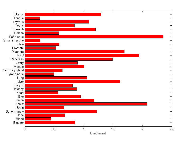 The expression level is normalized with tissue-library size. Each value for a gene in a tissue is a ratio of observed ESTs to the expected one in this tissue. The expected number of ESTs is the product of total ESTs of the gene and the fraction of total ESTs in the tissue among all ESTs in 30 tissues.