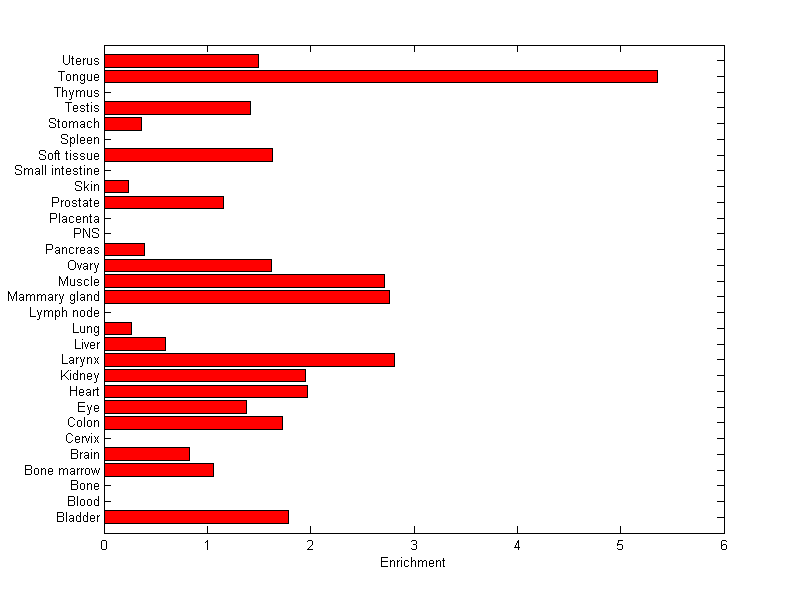 The expression level is normalized with tissue-library size. Each value for a gene in a tissue is a ratio of observed ESTs to the expected one in this tissue. The expected number of ESTs is the product of total ESTs of the gene and the fraction of total ESTs in the tissue among all ESTs in 30 tissues.