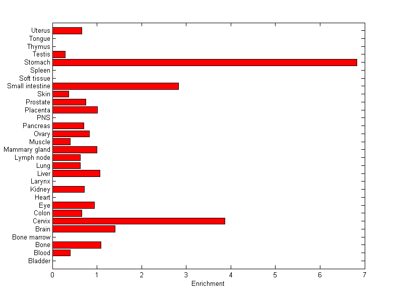 The expression level is normalized with tissue-library size. Each value for a gene in a tissue is a ratio of observed ESTs to the expected one in this tissue. The expected number of ESTs is the product of total ESTs of the gene and the fraction of total ESTs in the tissue among all ESTs in 30 tissues.