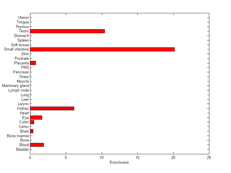 About the profile: The expression level is normalized with tissue-library size. Each value for a gene in a tissue is a ratio of observed ESTs to the expected one in this tissue. The expected number of ESTs is the product of total ESTs of the gene and the fraction of total ESTs in the tissue among all ESTs in 30 tissues. Summary: This gene is preferentially expressed in [kidney, testis] Download: |