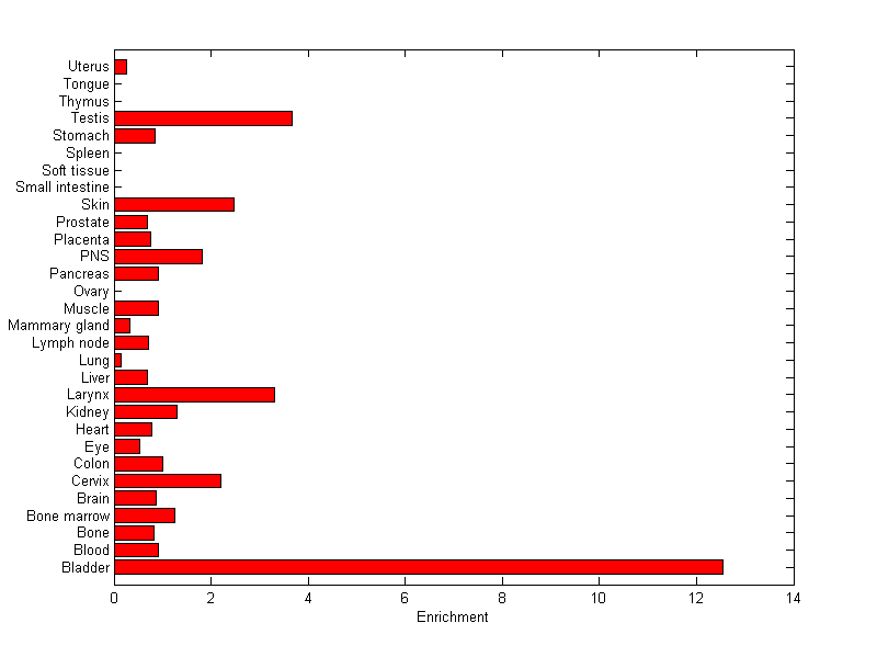 The expression level is normalized with tissue-library size. Each value for a gene in a tissue is a ratio of observed ESTs to the expected one in this tissue. The expected number of ESTs is the product of total ESTs of the gene and the fraction of total ESTs in the tissue among all ESTs in 30 tissues.