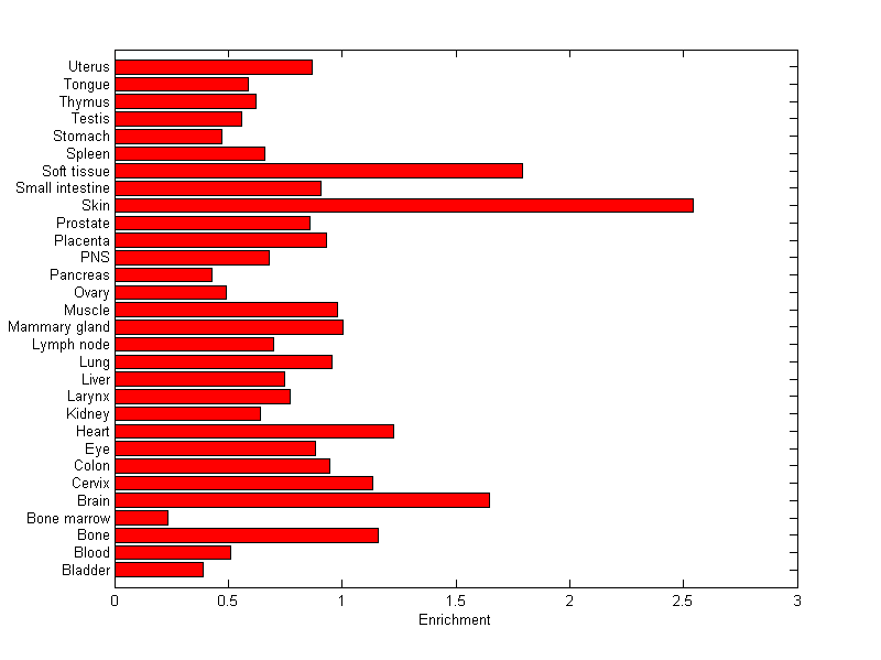 The expression level is normalized with tissue-library size. Each value for a gene in a tissue is a ratio of observed ESTs to the expected one in this tissue. The expected number of ESTs is the product of total ESTs of the gene and the fraction of total ESTs in the tissue among all ESTs in 30 tissues.