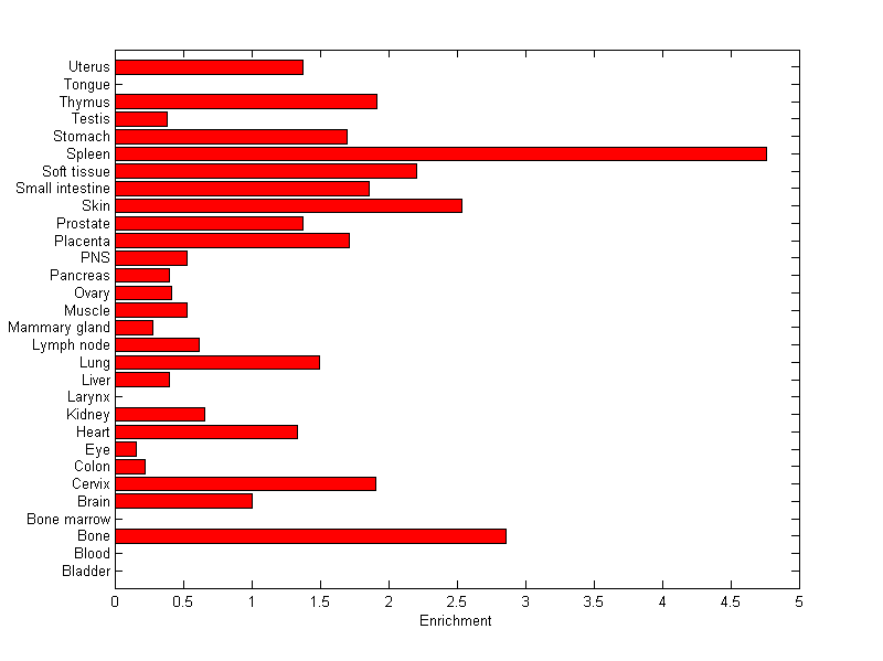The expression level is normalized with tissue-library size. Each value for a gene in a tissue is a ratio of observed ESTs to the expected one in this tissue. The expected number of ESTs is the product of total ESTs of the gene and the fraction of total ESTs in the tissue among all ESTs in 30 tissues.