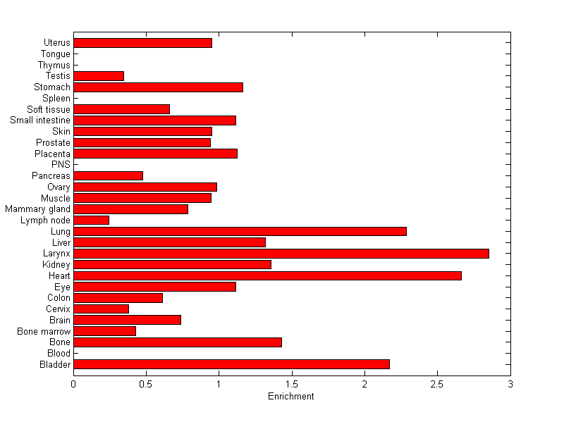 The expression level is normalized with tissue-library size. Each value for a gene in a tissue is a ratio of observed ESTs to the expected one in this tissue. The expected number of ESTs is the product of total ESTs of the gene and the fraction of total ESTs in the tissue among all ESTs in 30 tissues.