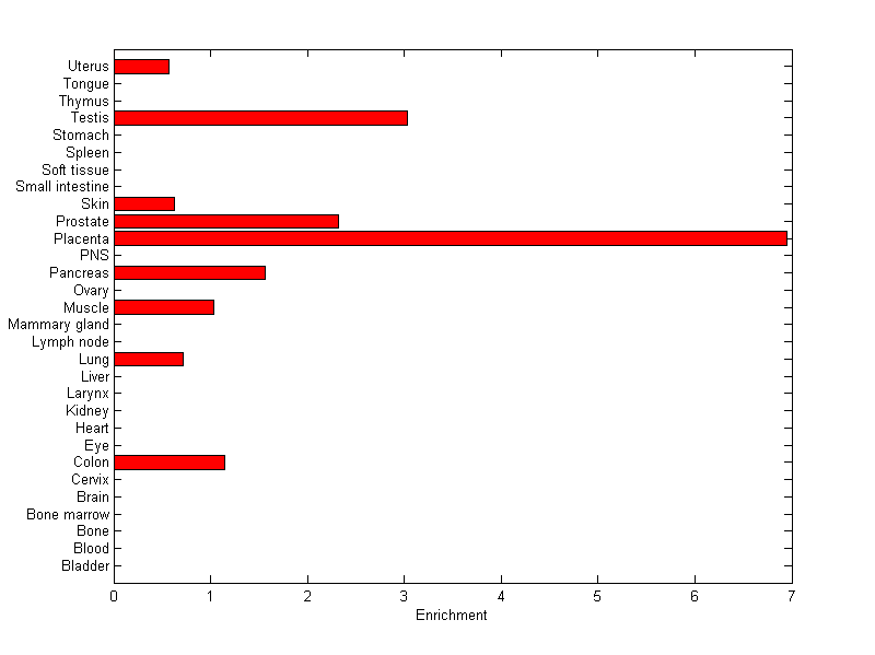 The expression level is normalized with tissue-library size. Each value for a gene in a tissue is a ratio of observed ESTs to the expected one in this tissue. The expected number of ESTs is the product of total ESTs of the gene and the fraction of total ESTs in the tissue among all ESTs in 30 tissues.