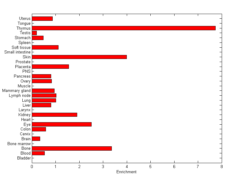 The expression level is normalized with tissue-library size. Each value for a gene in a tissue is a ratio of observed ESTs to the expected one in this tissue. The expected number of ESTs is the product of total ESTs of the gene and the fraction of total ESTs in the tissue among all ESTs in 30 tissues.