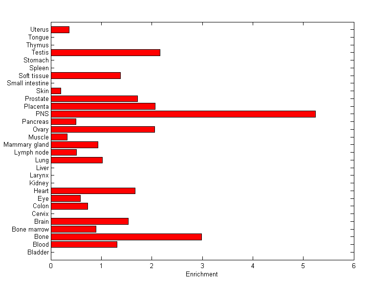 The expression level is normalized with tissue-library size. Each value for a gene in a tissue is a ratio of observed ESTs to the expected one in this tissue. The expected number of ESTs is the product of total ESTs of the gene and the fraction of total ESTs in the tissue among all ESTs in 30 tissues.
