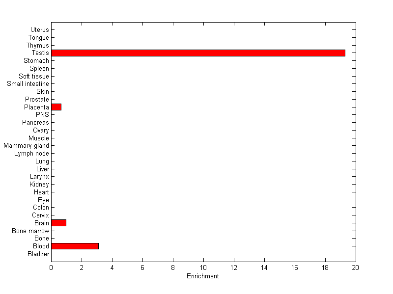 The expression level is normalized with tissue-library size. Each value for a gene in a tissue is a ratio of observed ESTs to the expected one in this tissue. The expected number of ESTs is the product of total ESTs of the gene and the fraction of total ESTs in the tissue among all ESTs in 30 tissues.
