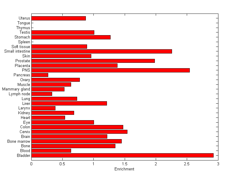 The expression level is normalized with tissue-library size. Each value for a gene in a tissue is a ratio of observed ESTs to the expected one in this tissue. The expected number of ESTs is the product of total ESTs of the gene and the fraction of total ESTs in the tissue among all ESTs in 30 tissues.