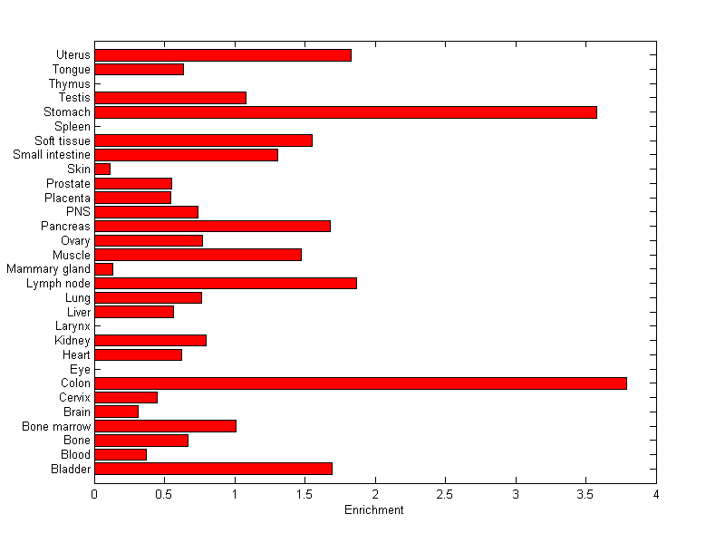 The expression level is normalized with tissue-library size. Each value for a gene in a tissue is a ratio of observed ESTs to the expected one in this tissue. The expected number of ESTs is the product of total ESTs of the gene and the fraction of total ESTs in the tissue among all ESTs in 30 tissues.