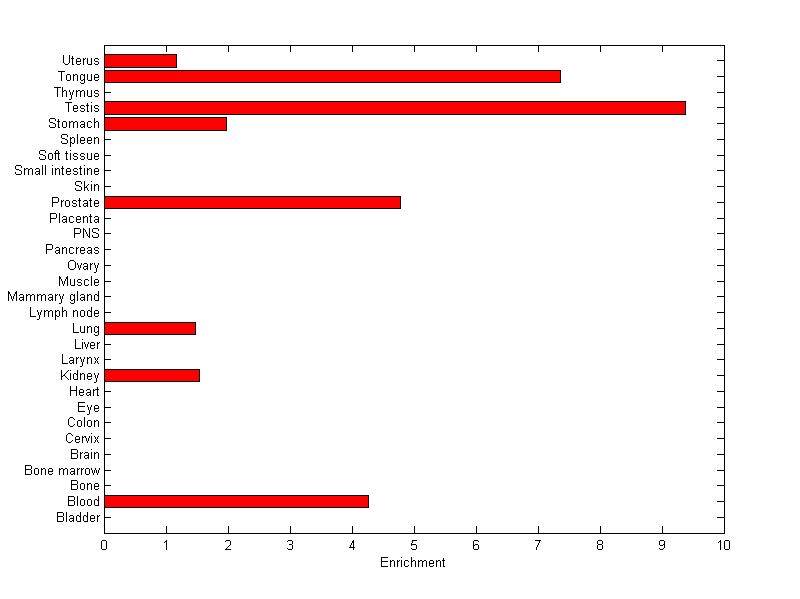The expression level is normalized with tissue-library size. Each value for a gene in a tissue is a ratio of observed ESTs to the expected one in this tissue. The expected number of ESTs is the product of total ESTs of the gene and the fraction of total ESTs in the tissue among all ESTs in 30 tissues.