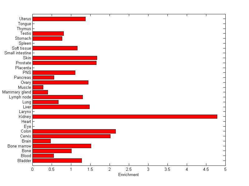 The expression level is normalized with tissue-library size. Each value for a gene in a tissue is a ratio of observed ESTs to the expected one in this tissue. The expected number of ESTs is the product of total ESTs of the gene and the fraction of total ESTs in the tissue among all ESTs in 30 tissues.