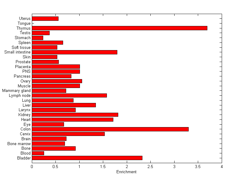 The expression level is normalized with tissue-library size. Each value for a gene in a tissue is a ratio of observed ESTs to the expected one in this tissue. The expected number of ESTs is the product of total ESTs of the gene and the fraction of total ESTs in the tissue among all ESTs in 30 tissues.
